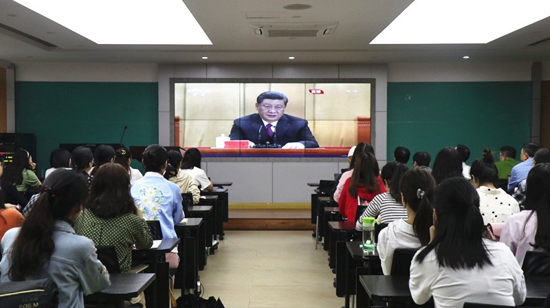组织师生在学院第一会议室观看 “纪念五四运动100周年大会”现场直播。高辣文