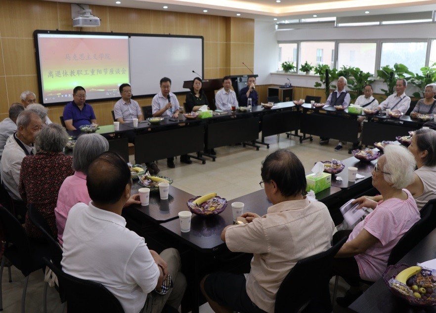 在学院412教室举行了重阳节离退休教职工座谈会。学院领导班子、工会教代会主席杨长福以及三十余位离退休教职工参加座谈会,会议由学院党委书记罗滌主持。