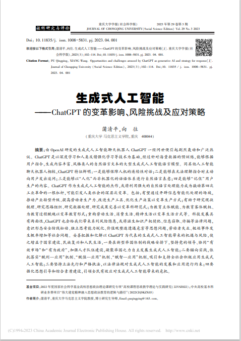由OpenAI研发的生成式人工智能聊天机器人ChatGPT一经问世便引起剧烈轰动和广泛热议。ChatGPT是以深度学习和人类反馈强化学习等技术为基础,经过针对海量数据的预训练,能够根据用户指令,生成内容丰富、风格类人的自然语言文本的大型生成式人工智能语言模型。同其他人工智能聊天机器人相较,ChatGPT特征鲜明:一是能够保障人机的连续性对话;二是能够在无法理解指令时主动向用户发出追问;三是能够以“人化”而非机器化的话语体系进行自然语言表意;四是能够“记住”用户生产的内容。ChatGPT作为生成式人工智能的杰作,或将利用强大的自然语言处理能力成为撬动第四次工业革命的一根杠杆,可能引发人类社会的深层次变革。包括:有望通过开辟信息智能化处理的场域,推动产业转型升级、提高劳动者生产力、改进生产工具、优化生产决策以变革生产方式;有助于研究现状梳理、研究思路组织、研究数据处理、研究成果完善以变革科研范式;为教育主体赋能、为教育客体赋权、为教育过程赋魂以变革教育形式;重构劳动生活、消费生活、精神生活以变革生活方式等。科技发展具有两面性,ChatGPT也会给我们带来系列风险隐患,或将滋生知识产权侵犯、信息窃取、诈骗等法律问题,意识形态安全防线松动、独立思考能力蜕化、价值观塑造遭遇危害等思想问题,劳动者失业、极端事件发生概率增加等社会问题。妥善把握和化解以ChatGPT为代表的生成式人工智能带来的机遇与风险,使之增益于国家建设、民族复兴和人民生活,一要在新型举国体制的战略安排下,坚持党的领导、协同“有效市场”和“有为政府”加强人才队伍建设,凝聚举国之力自主发展生成式人工智能;二要锚向实践,依托落实“赋利—应用”机制、“赋值—应用”机制、“赋智—应用”机制,吸引和支持全社会积极应用生成式人工智能;三要坚持立法先行和严格执法,以法律法规对生成式人工智能的发展和应用进行约束;四要强化思想引导和综合素质建设,引领全民有效应对生成式人工智能带来的危机。