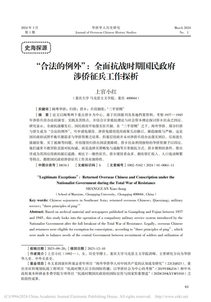 论文以闽粤两个重点侨乡为中心,基于民国报刊及各地档案资料,考察1937—1945年涉侨兵役办法的演变、实践及其特点,并结合日常抵抗理论与社会资本理论探讨侨乡民众之因应。研究显示,全面抗战爆发后,国民政府开始落实征兵制。在“三平原则”之下,海外华侨、部分归侨与侨生成为“合法的例外”,可申请免缓役。涉侨免缓役优待政策几经修订,渐趋细致与严格,这是国民政府试图平衡兵源需求与华侨资源之结果。但基层役政并未对涉侨兵役办法落实到位,反而滋生强制征集、买丁抵额等问题,并给缓役归侨出国设置障碍。侨乡民众利用独特的华侨资源予以因应。他们通常不敢冒险直接对抗权威,而是选择买替贿免与逃跑等日常抵抗方式。侨乡便利的条件,使出洋成为其因应役政的最后退路。相比于一般性征兵,侨乡缓役者众多、拥有侨汇收入、人口流动频繁等特点,都使国民政府涉侨征兵工作具有独特性。