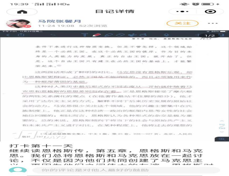 为期12天的红岩读书会搭建了阅读和交流的平台,架起了经典与时代的桥梁,让同学们在活跃的讨论氛围中进行激烈的思想交锋,进一步学习和传承了科学的马克思主义观。来自经管学院的徐淄浩同学表示:“这次‘红岩读书会’让我收获了别样的学习体验,感受到了恩格斯的精神风范和马克思主义的真理力量。”同时,他希望“红岩读书会”能够开辟更丰富的形式,开展更广泛的交流,引导更多的同学用实际行动践行科学信仰。