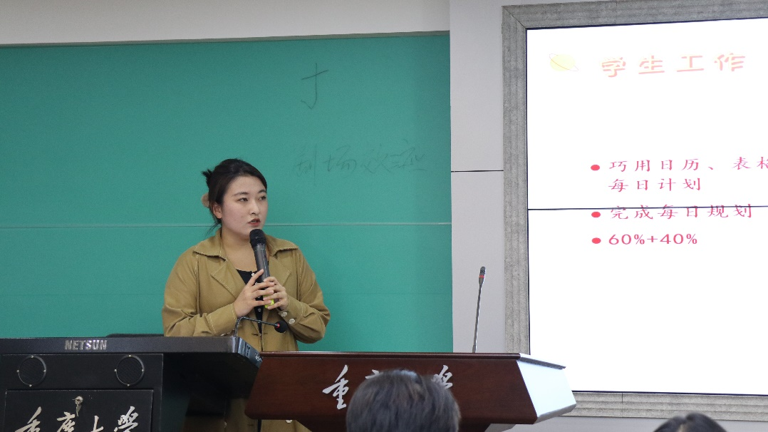 董瑞祺向大家展示了研究生期间丰富的实践履历,并就如何做好学生工作展开交流。她认为;首先要明确目标方向,做好整理归纳,积极争取进步机会;其次要做好时间规划,巧用日历、表格等工具,提高时间利用效率;最后要有所选择,合理安排好工作与学习,在继承的基础上有所创新,既怀抱梦想又脚踏实地,敢想敢为又善作善成。