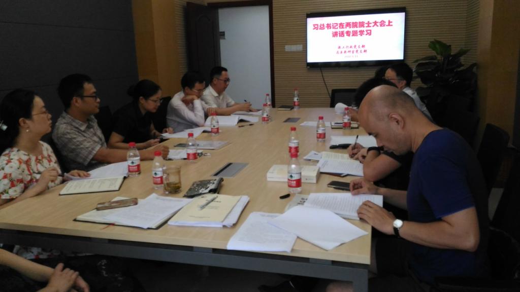 在学院在439室举行习近平总书记在中国科学院第十九次院士大会、中国工程院第十四次院士大会上的讲话精神专题学习会。学习会由马克思主义基本原理教研室教师党支部和教职工行政党支部联合举办。学院党委书记罗滌、副院长徐鲲、副书记、纪委书记温健琳以及两个支部党员老师参加了此次学习会。教职工行政党支部书记罗慧莲主持学习会。