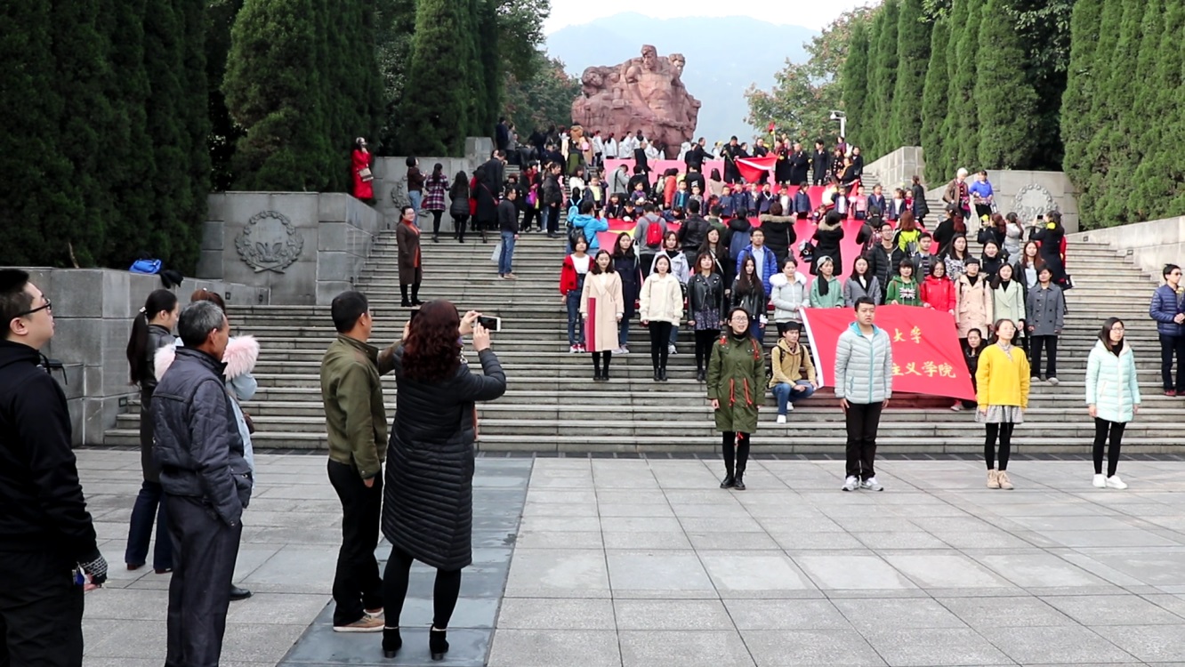 上午8时,同学们准时到达“红岩魂”广场。代表着“11•27”纪念日的建筑设计顿时让氛围严肃了下来。在革命烈士雕像下、国旗党旗前,马院学子激情澎湃、热情高亢地朗诵起《歌颂祖国》,表达了对革命烈士的深切怀念和对祖国河山的美好祝福。朗诵吸引了在场其他参观单位的驻足,他们一边感到丝丝意外,一边掏出手机或致以掌声。在烈士墓前,在哀曲的感染下,同学们纷纷低垂着头向烈士们致敬并瞻仰了革命烈士陵园纪念碑。