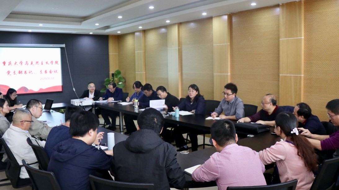 罗滌书记在会上首先通报了学院设岗聘任、博士点申报、人才引进、教学科研奖励等工作的相关情况,她指出,各党支部要切实认真开展好“不忘初心、牢记使命”主题教育,希望全院上下齐心协力,不断推动学院各项事业持续发展。接下来,她和全体与会人员一起分享了周旬书记在重庆市加强学校思想政治理论课工作座谈会上的发言,强调学院思政课教师要认真学习领会习近平总书记关于办好学校思想政治理论课的重要论述,充分发挥马克思主义理论学科的价值引领,进一步发挥思政课教师主动性积极性创造性,努力推动思政课教学改革,培养德智体美劳全面发展的社会主义建设者和接班人。