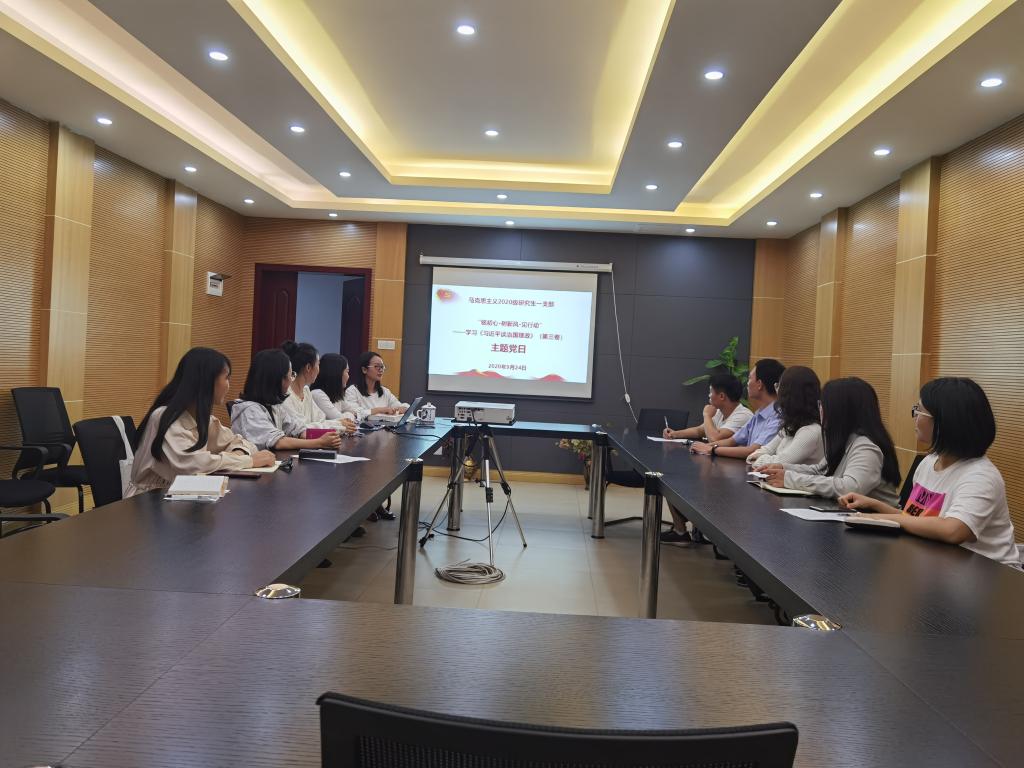 2020级研究生一支部在学院414会议室开展名为“铭初心·树新风·见行动”——《习近平谈治国理政》(第三卷)主题党日活动。