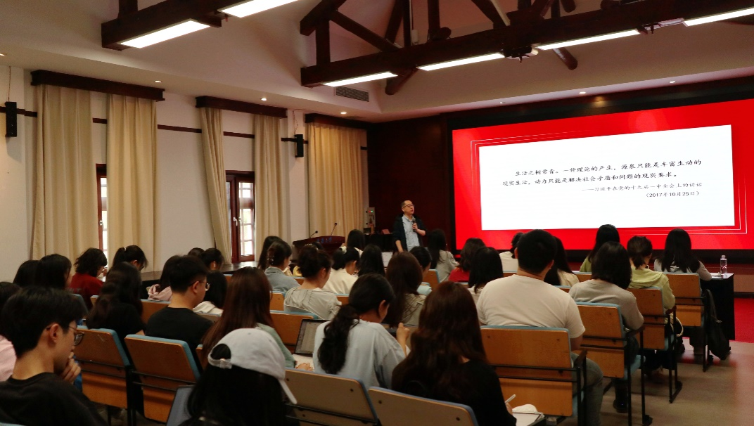 蒋楼从创立背景、主要内容、历史地位、实践路径四个层面讲解了习近平新时代中国特色社会主义思想。他以生动鲜活、通俗易懂的语言阐释了两个主要问题:一是习近平新时代中国特色社会主义思想的创立离不开“两个大局”同步交织、相互激荡的时代背景,离不开“两个结合”的必由之路,回答了重大的时代课题;二是习近平新时代中国特色社会主义思想在马克思主义哲学、马克思主义政治经济学、科学社会主义等方面做出了新的理论贡献,充分体现了新时代中国共产党治国理政的传统文化智慧,实现了马克思主义中国化时代化新的飞跃。