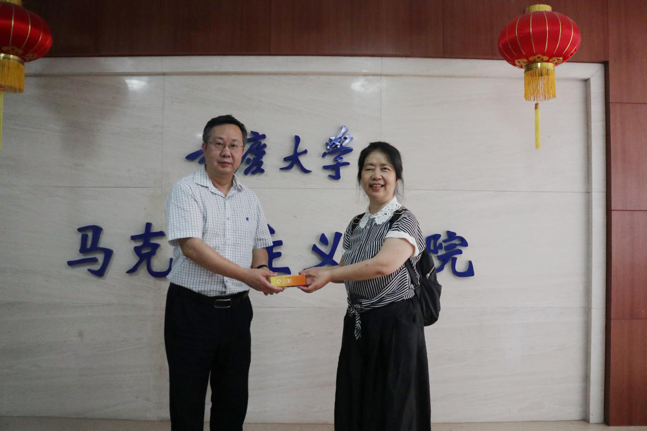 张邦辉院长感谢孙青老师几十年来兢兢业业为学院教学工作作出的贡献,并代表学院领导班子衷心祝愿孙老师退休生活更加多姿多彩,幸福安康!最后,张院长代表学院为孙老师送上了退休慰问品并合影留恋。