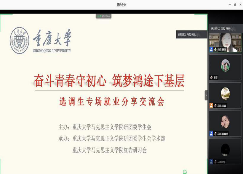 在“腾讯会议”分别举行了选调生和教师岗的求职经验交流会。本次分享交流会特邀成功考取选调生的蒋艺、李正超、谭小霞、卫婷婷以及即将入职教师岗位的兰青青、郑晶芮、唐旭荣等7位2020届毕业研究生同学进行就业经验分享。此次经验分享会共约120名同学参与。