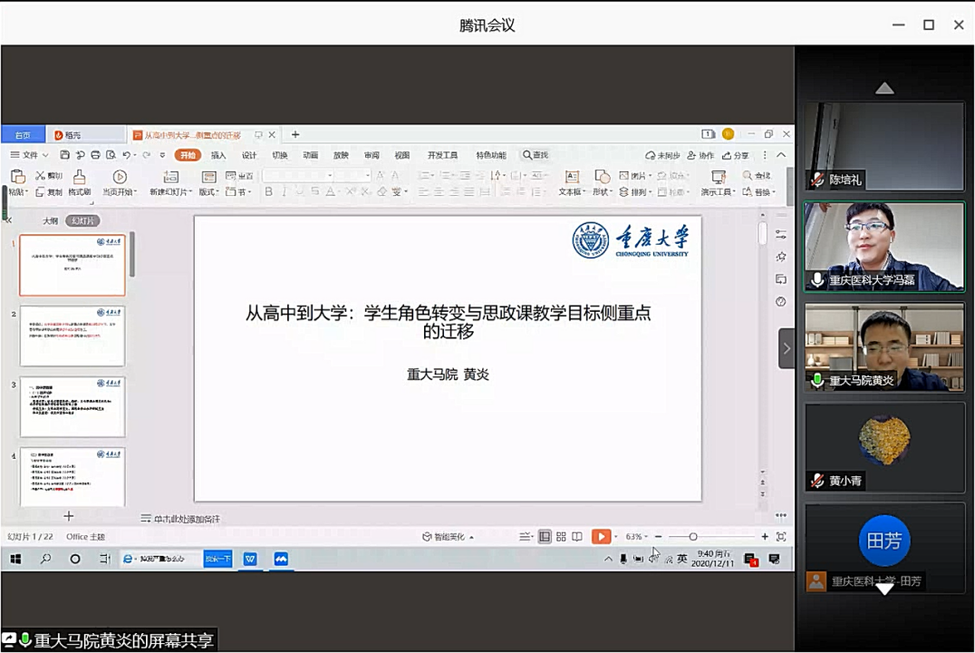 2020.12.11日上午,重庆市高校思想政治理论课手拉手行动(第一组)大中小学“手拉手”同备一堂思政课研讨会在“腾讯会议”上成功举办。此次研讨会由重庆医科大学高辣文