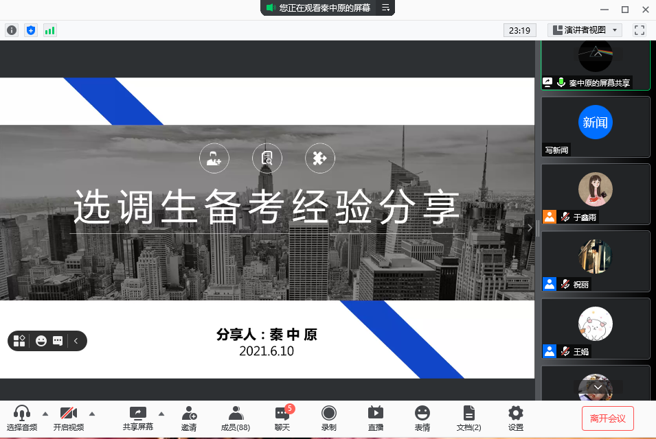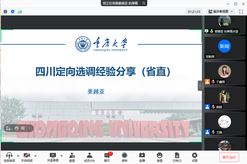 成功考取选调生的王琼莹、秦中原、罗旭、姜越亚4位2021届毕业研究生进行经验分享。此次活动约90名同学参与。