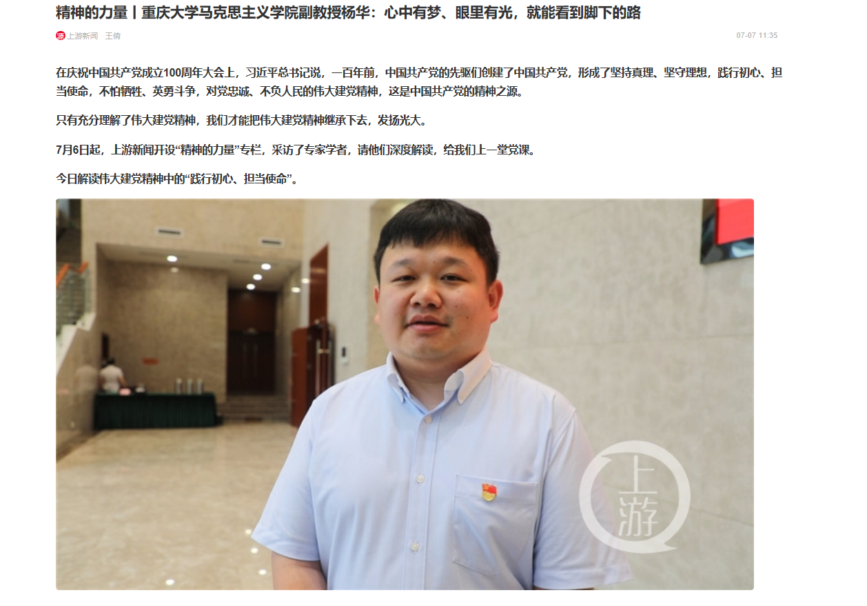 7月7日,高辣文 杨华副教授接受上游新闻“精神的力量”专栏采访,解读中国共产党伟大建党精神中的“践行初心、担当使命”。