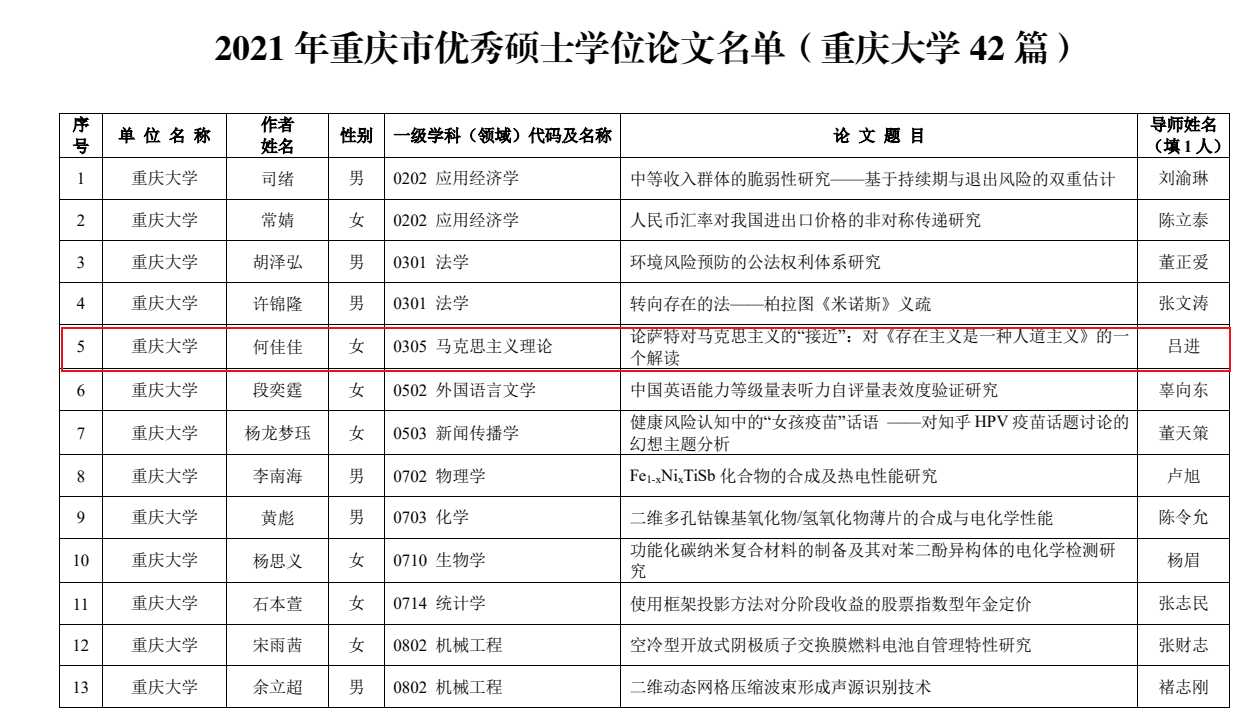 近日,重庆市教育委员会公布了2021年重庆市优秀博士、硕士学位论文评选结果,高辣文 吕进教授所指导硕士生何佳佳的毕业论文获评重庆市优秀硕士学位论文。