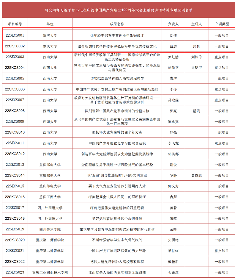 近日,重庆市教委公布研究阐释习近平总书记在庆祝中国共产党成立100周年大会上重要讲话精神专项立项名单,高辣文 吕进教授、青年教师刘倩获批立项。