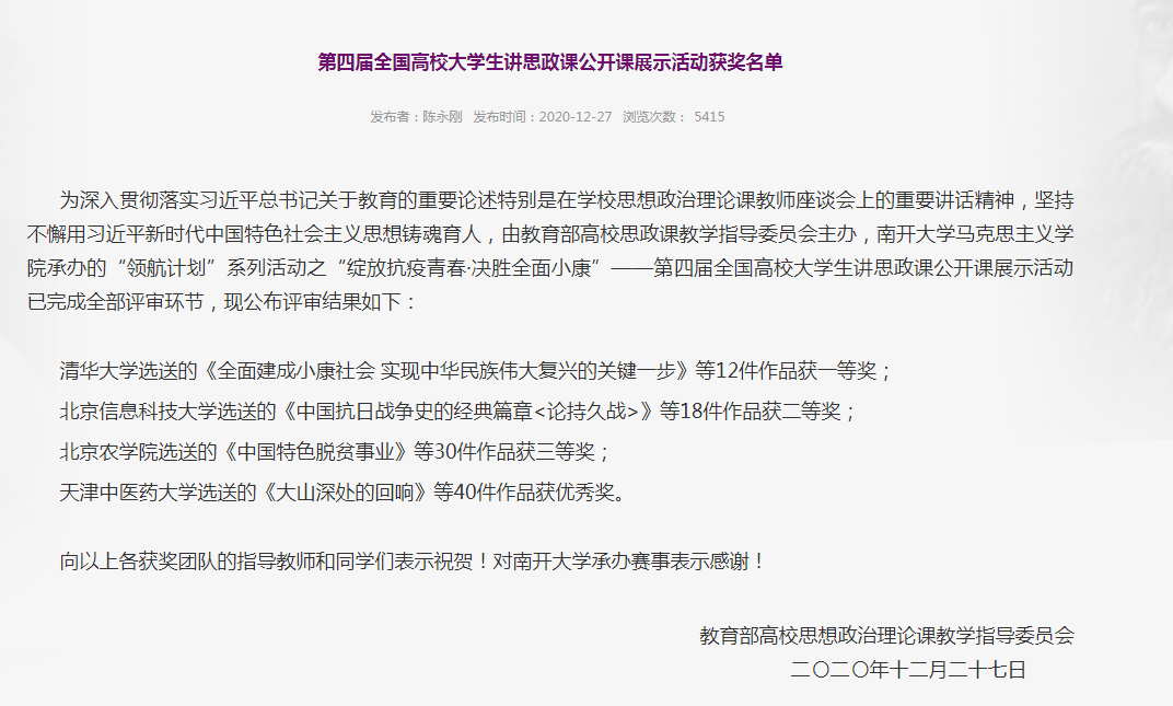 近日,由教育部高校思政课教学指导委员会主办,南开大学高辣文 承办第四届全国高校大学生讲思政课公开课展示活动公布评审结果,我院选送的《三场硬仗显力量乘风破浪看我党——中国共产党领导是中国特色社会主义制度的最大优势》在评选中获得二等奖,该作品由我院蒋荣老师指导,学生负责人为张礼琼同学。