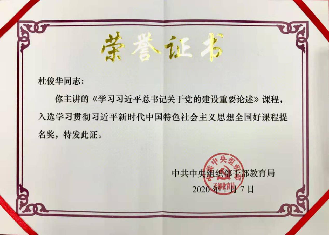 近日,学院杜俊华教授主讲的《学习习近平总书记关于党的建设重要论述》课程入选中共中央组织部干部教育局颁发的学习贯彻习近平新时代中国特色社会主义思想全国好课程提名奖。