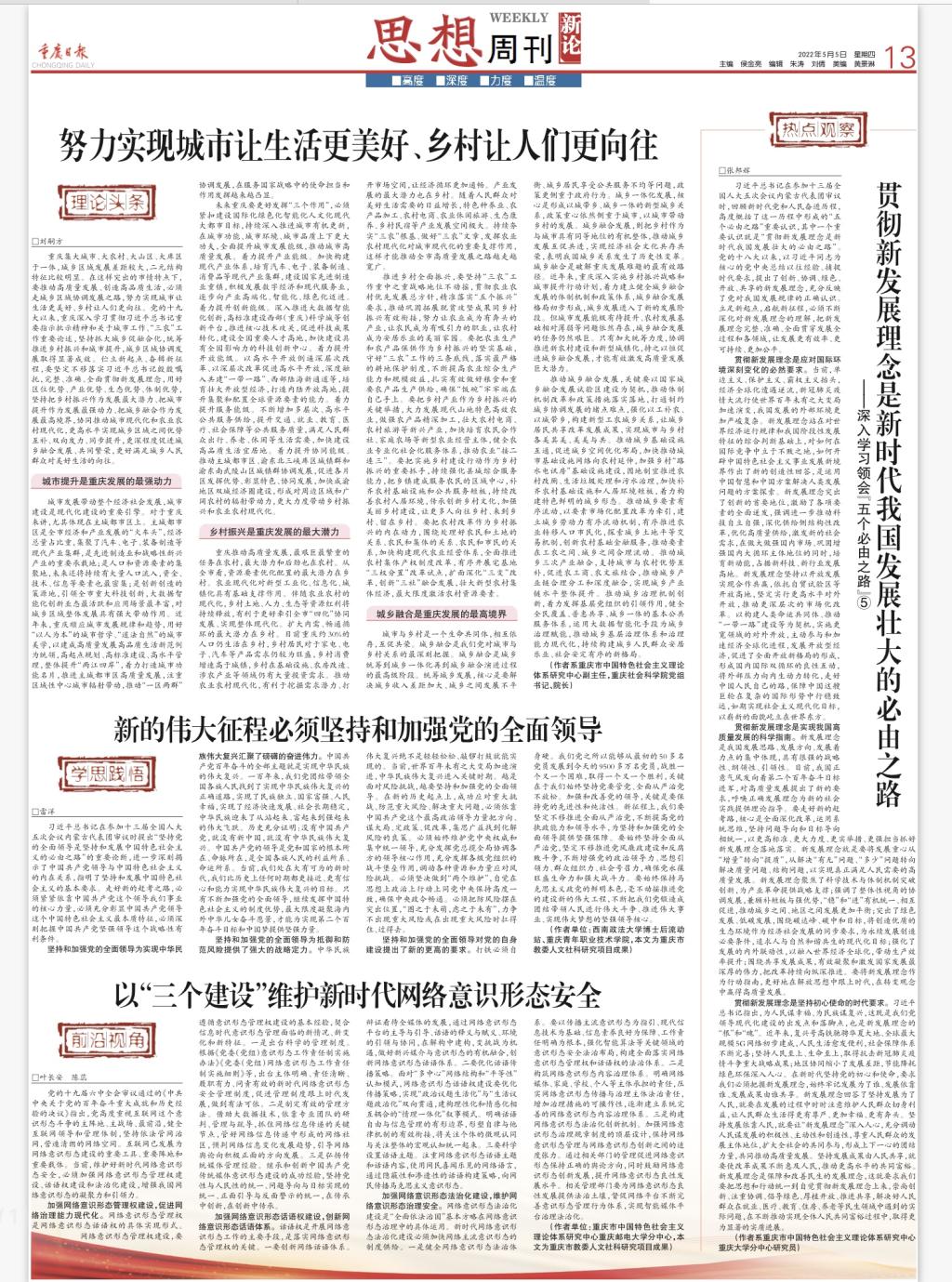 2022年5月5日出版的《重庆日报》刊发张邦辉院长《贯彻新发展理念是新时代我国发展壮大的必由之路》一文,文章深入阐述习近平总书记在参加十三届全国人大五次会议内蒙古代表团审议时,回顾新时代党和人民奋进历程,高度概括了这一历程中形成的“五个必由之路”中的“贯彻新发展理念是新时代我国发展壮大的必由之路”。