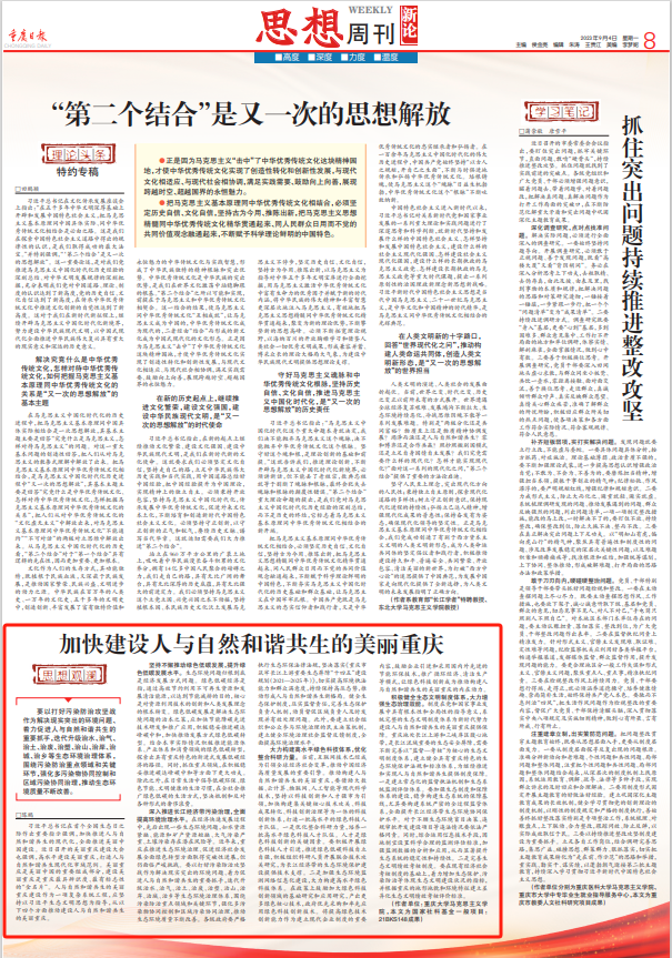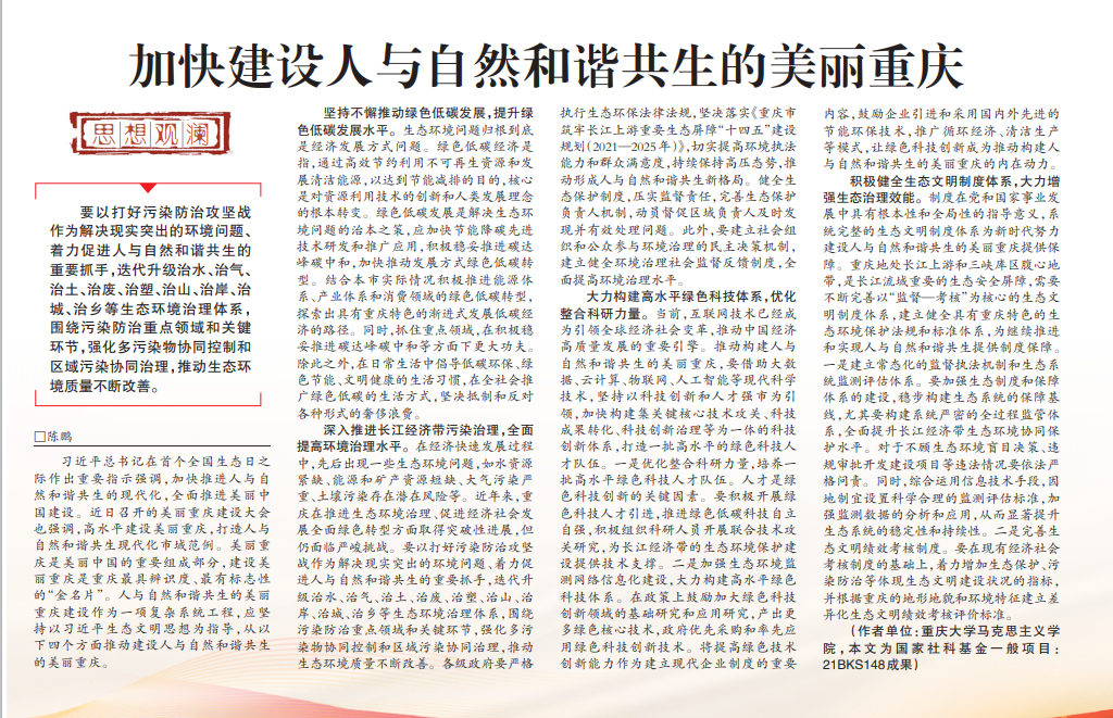 2023年9月4日,我院陈鹏博士在《重庆日报》思想周刊栏目发表《加快建设人与自然和谐共生的美丽重庆》一文。