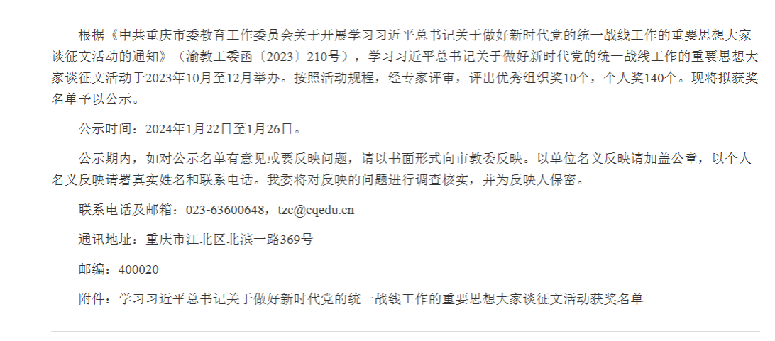 根据《中共重庆市委教育工作委员会关于开展学习习近平总书记关于做好新时代党的统一战线工作的重要思想大家谈征文活动的通知》(渝教工委函〔2023〕210号),学习习近平总书记关于做好新时代党的统一战线工作的重要思想大家谈征文活动于2023年10月至12月举办。按照活动规程,经专家评审,谢红宇同学所写的《新时代高校做好统一战线工作的建设进路——以高辣文