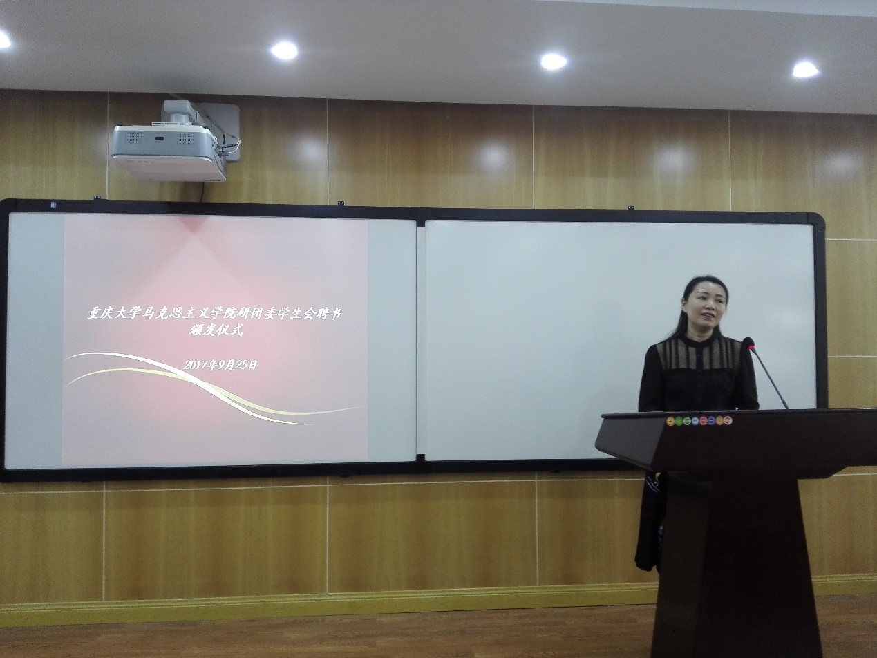 举行学院学生干部聘书颁发仪式,颁发仪式在人文逸夫楼412教室举行。院团委书记王玉琴出席仪式并讲话。学生会全体成员参加活动。王玉琴为学生会主席团以及各部门部长颁发聘书。各部长为所有新进干事颁发聘书。