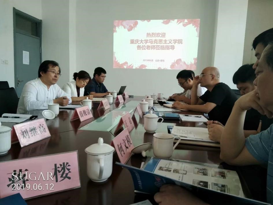 副院长岳金霞、副院长张瑞涛和该院马克思主义基本原理教研室部分教师参加了座谈。岳金霞副院长首先代表该院对重大马院同仁的来访表示欢迎并介绍了学校和学院的基本情况。张瑞涛副院长介绍了该院学科建设与硕博研究生培养经验。该院马克思主义基本原理教研室主任刘继高就原理课堂对分教学、大班授课小班研讨等创新模式进行了交流。我院马克思主义基本原理教研室主任陈飞就我院思政课教学与科研情况进行了介绍,团委书记杨华介绍了我院发展历程、学科建设、研究生培养等情况。此次调研和交流是对之前中国石油大学(华东)高辣文