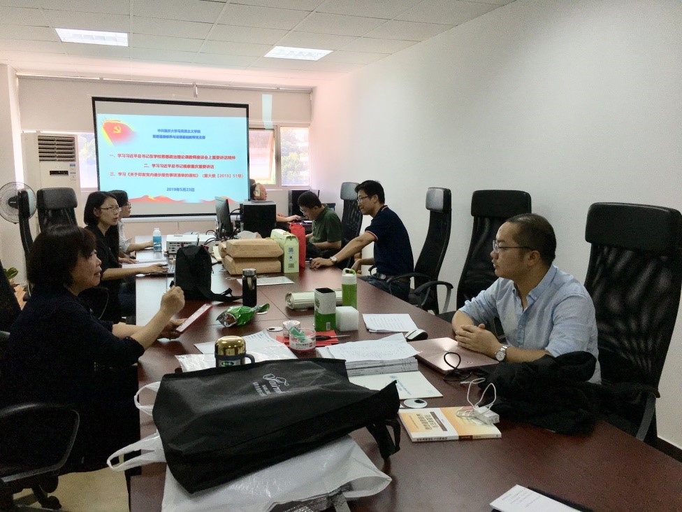 杨泽文老师首先组织支部党员集中学习了《习近平总书记视察重庆重要讲话》、《习近平总书记在五四运动100周年纪念大会上的讲话》、《习近平总书记在学校思想政治理论课教师座谈会上重要讲话》、《中国共产党重大事项请示报告条例》等文件精神,之后组织支部党员围绕本次主题党日活动的学习内容进行了充分深入的讨论,并建议各位党员结合思政课教师的工作实际特别是如何把习总书记系列重要讲话的精神贯穿到《思想道德修养与法律基础》课的教学中进行了重点研讨。