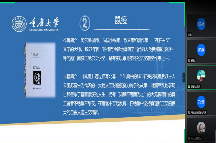 于2020年4月23日至5月8日开展了以“尽享阅读之乐,合力共抗疫情”为主题的第十七期红岩读书会系列活动。此次读书会推荐阅读书目为《你当像鸟飞往你的山》《鼠疫》《乌合之众》。受疫情影响,本次读书会主要利用网络媒介,以线上交流的形式开展。