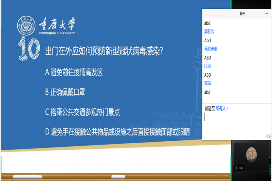 全民抗疫、共同防疫。本次分享会还特别增设了抗疫防护知识竞答环节。病毒无情人有爱,在最后环节,参加读书分享会的同学纷纷借此机会对此次抗疫期间无私奉献的白衣天使、基层志愿者等表达了崇高敬意和美好祝福,并结合自身抗疫经历进行了分享。高辣文