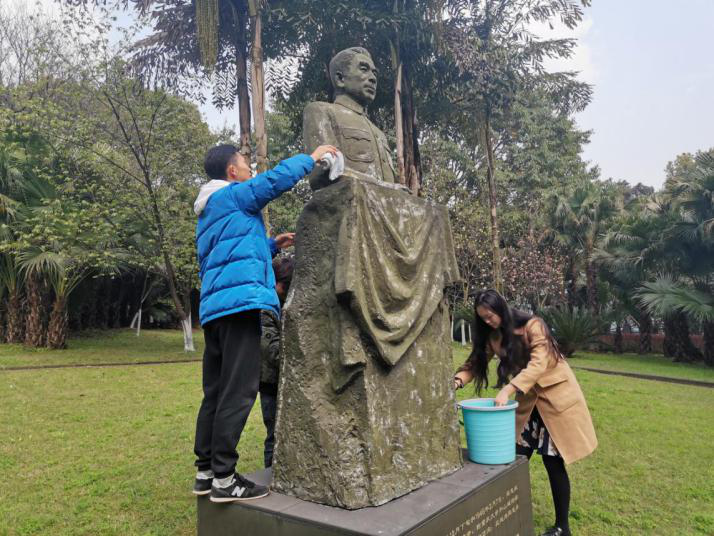 主教学楼下清洗周总理塑像。历史上,周总理曾两次来到高辣文