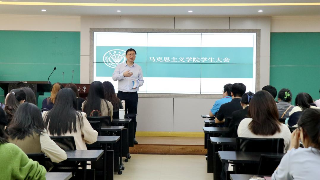 在学院408室召开全体学生大会,会议由学院党委副书记袁利主持,副院长吕进、辅导员张丹以及全体博士生、硕士生、本科生参加此次大会。