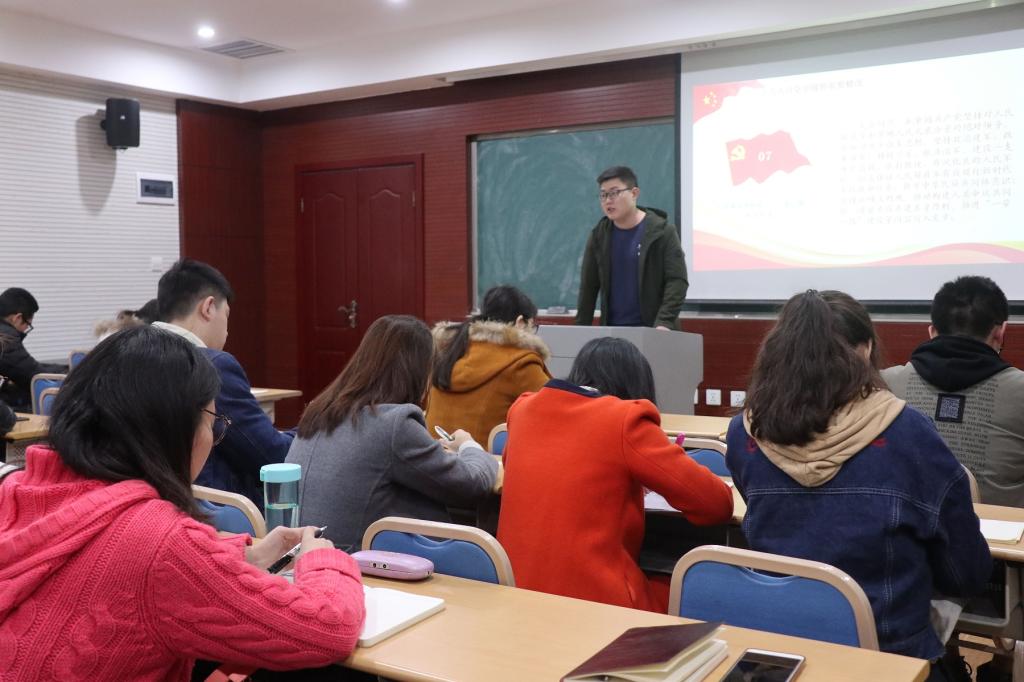 研究生第二党支部一直以来所做的工作和举办的一系列党建活动,包括,红岩讲坛,红岩读书会,“十九大报告句读”等。石佳老师重点谈了第二党支部未来的发展目标,即“网络党建进支部”,表示要努力搭建网络平台,宣传党的精神,感染更多群众。同时,石佳希望各兄弟党支部能够多提供技术支持,共同促进党支部的建设和发展。