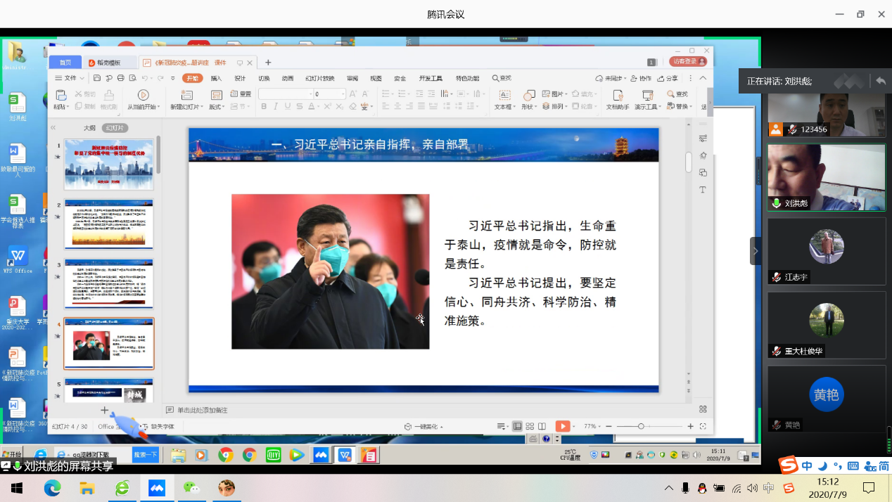 2020年7月9日下午,中国近现代史纲要教研室教师党支部以“讲战疫故事 悟初心使命”为主要内容召开了一次专题组织生活会。教师党员刘洪彪教授结合疫情期间的生动事例和鲜活人物故事为全体党员讲了一堂题为《新冠肺炎疫情防控彰显了党的集中统一领导的制度优势》的主题党课。党课结束后,各位党员同志结合疫情期间的身边人、身边事,谈切身体会、悟入党初心。