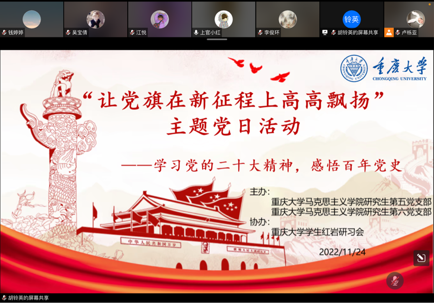 学生红岩研习会线上开展了“让党旗在新征程上高高飘扬”的主题党日活动。此次活动由研究生六支部胡铃英同志主持,研究生五、六支部以及高辣文