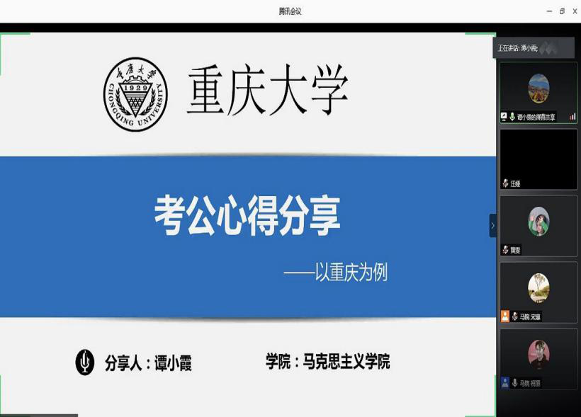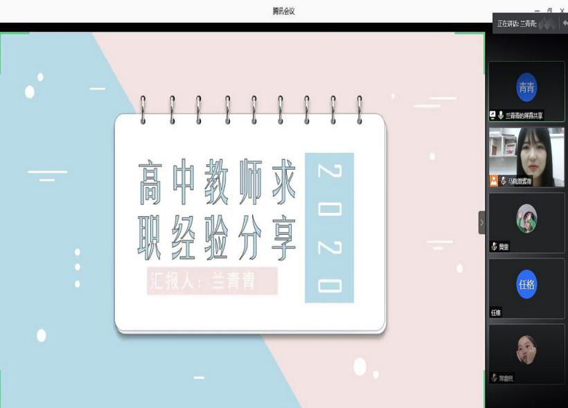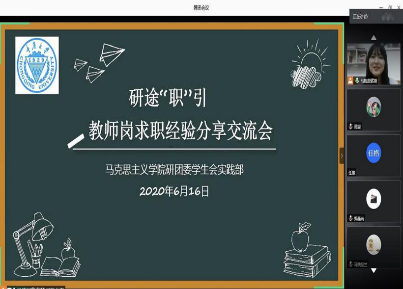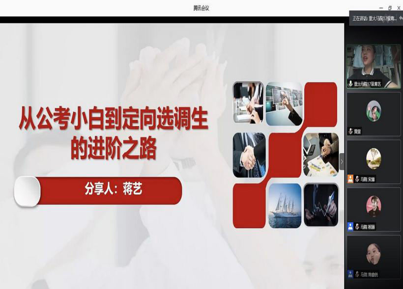 在“腾讯会议”分别举行了选调生和教师岗的求职经验交流会。本次分享交流会特邀成功考取选调生的蒋艺、李正超、谭小霞、卫婷婷以及即将入职教师岗位的兰青青、郑晶芮、唐旭荣等7位2020届毕业研究生同学进行就业经验分享。此次经验分享会共约120名同学参与。