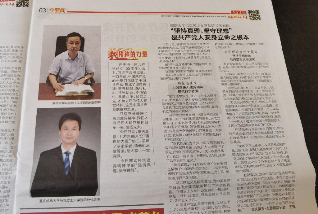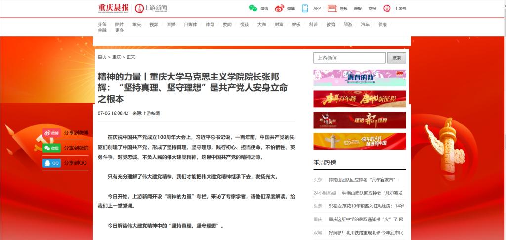 院长张邦辉教授进行了专题采访与报道,采访中,张邦辉解读了中国共产党伟大建党精神中的“坚持真理、坚守理想”。此条新闻被凤凰网、腾讯网、搜狐新闻、今日头条等10余家媒体网站、新闻客户端转载。