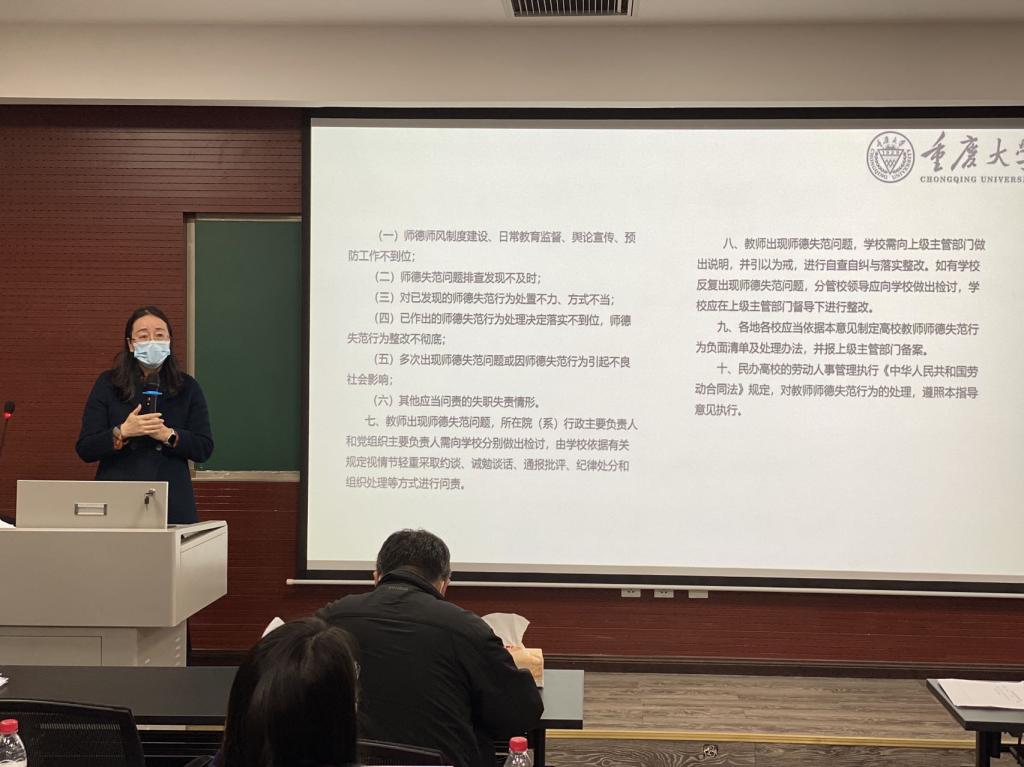 罗滌首先带领大家再次学习了《新时代高校教师职业行为十项准则》《教育部关于高校教师师德失范行为处理的指导意见》《研究生导师指导行为准则》等相关规章制度,她着重强调全体教职工要严格执行有关教育法律法规、职业道德规范和学校各项规章制度,认真学习有关法律、规范和制度,做到知法、懂法、守法,用严明的“戒尺”管好自己,用高尚的情操约束自己,不断增强遵纪守法、廉洁自律的自觉性,做“传道、授业、解惑”的典范。