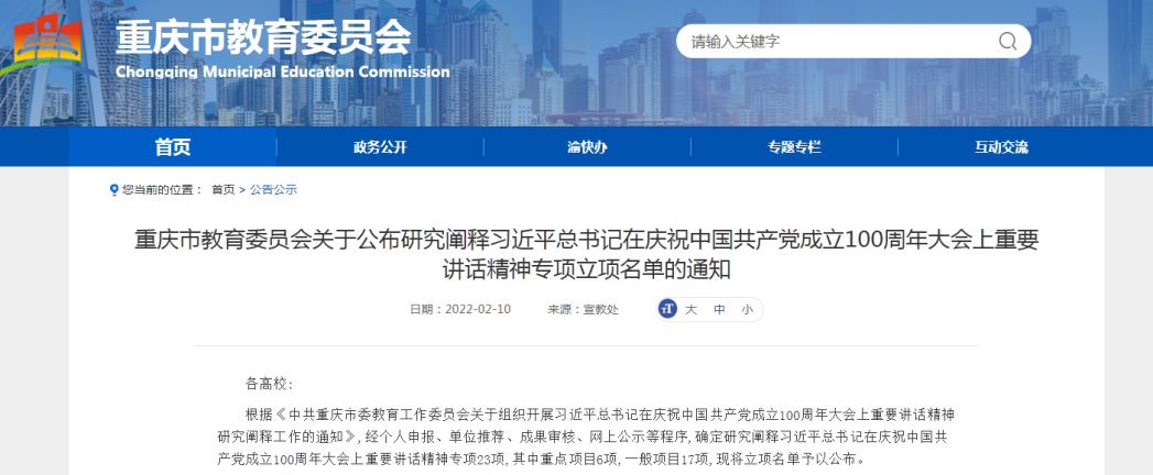 近日,重庆市教委公布研究阐释习近平总书记在庆祝中国共产党成立100周年大会上重要讲话精神专项立项名单,高辣文 吕进教授、青年教师刘倩获批立项。