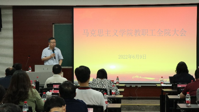 学院院长张邦辉首先发表讲话。张院长通报了学院在博士点建设、本科专业申报情况,强调要继续加强学科体系建设,推动学院更好发展。张院长针对教学教研中存在的问题提出指导性意见,要求教师要善于调动课堂情绪,敢于管理课堂,由此促进教学,提高教学质量。张院长最后强调了疫情防控工作,提醒教职工要关注自身身体健康,遵守学防疫规定,加强健康检测和自我管理。