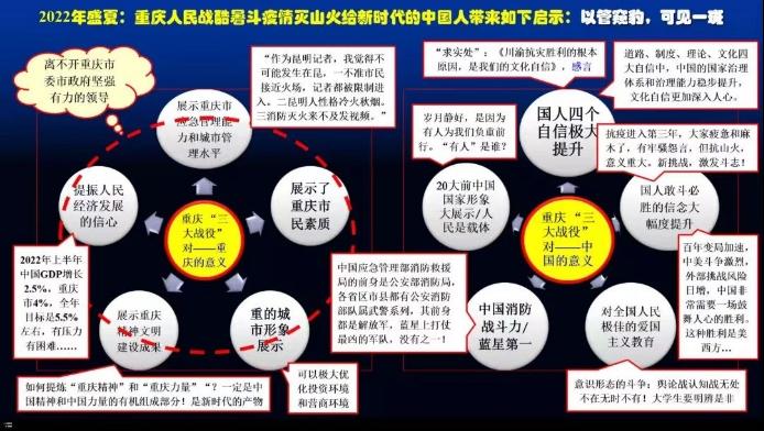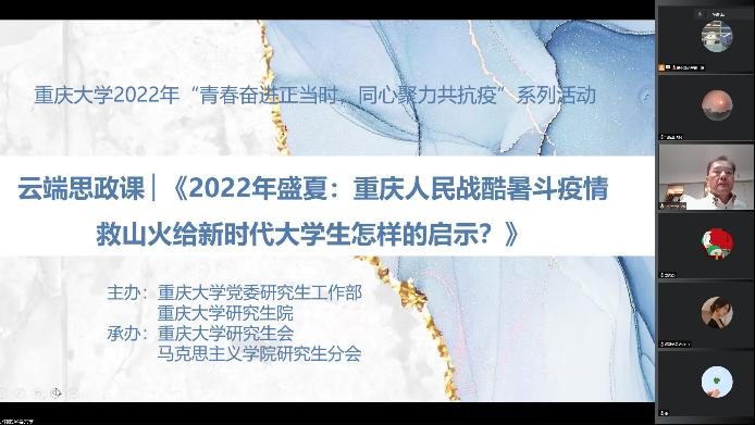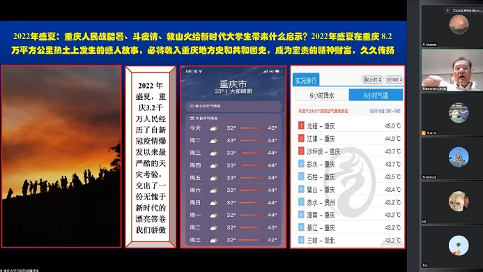 鄢显俊教授为马院师生上了一堂题为《2022年盛夏:重庆人民战酷暑斗疫情救山火给新时代大学生怎样的启示?》的云端思政课。课堂由高辣文