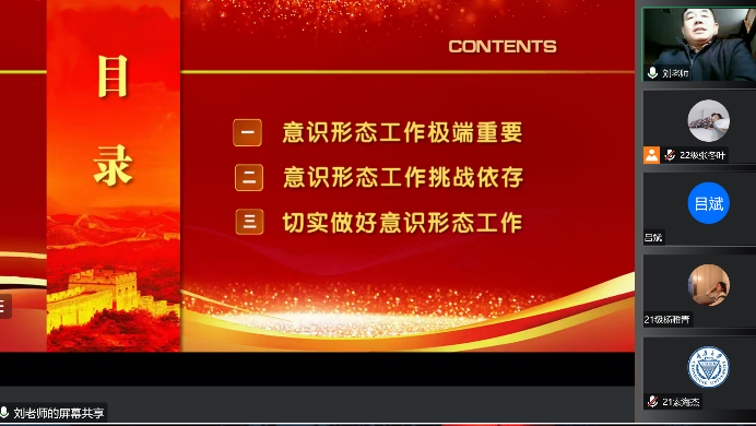 为加强理想信念教育、深刻认识意识形态工作的极端重要性,2022年12月1日下午,我院刘洪彪教授在“腾讯会议”平台作了题为“坚定不移做好新时代意识形态工作”的专题讲座。讲座由2022级硕士研究生张冬叶主持,来自全国各高校300余名师生参加了此次讲座。