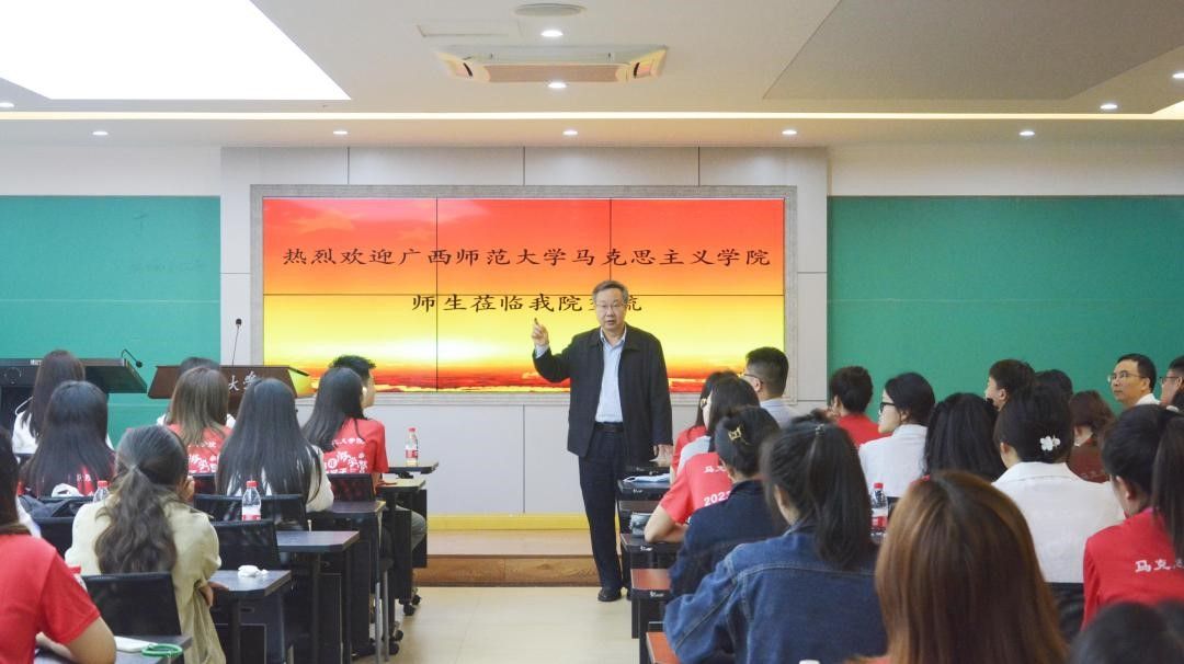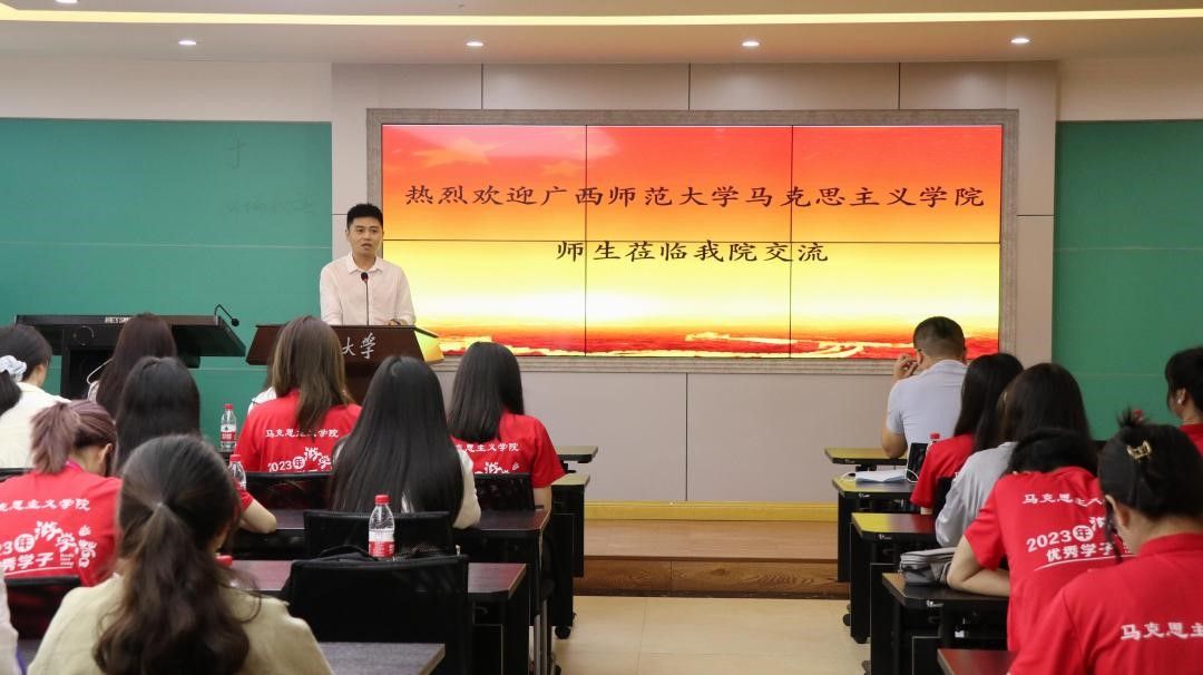的学科建设、科研工作、人才培养、思政课教学等方面与参访师生展开深入交流,并欢迎广西师大同学们报考重大马院继续深造。研团委学生会负责人董瑞祺汇报了学院学生工作,她从研团委学生会概况、组织建设、学生活动和获奖情况展开,重点介绍了学院特色活动和红岩宣讲团建设情况。