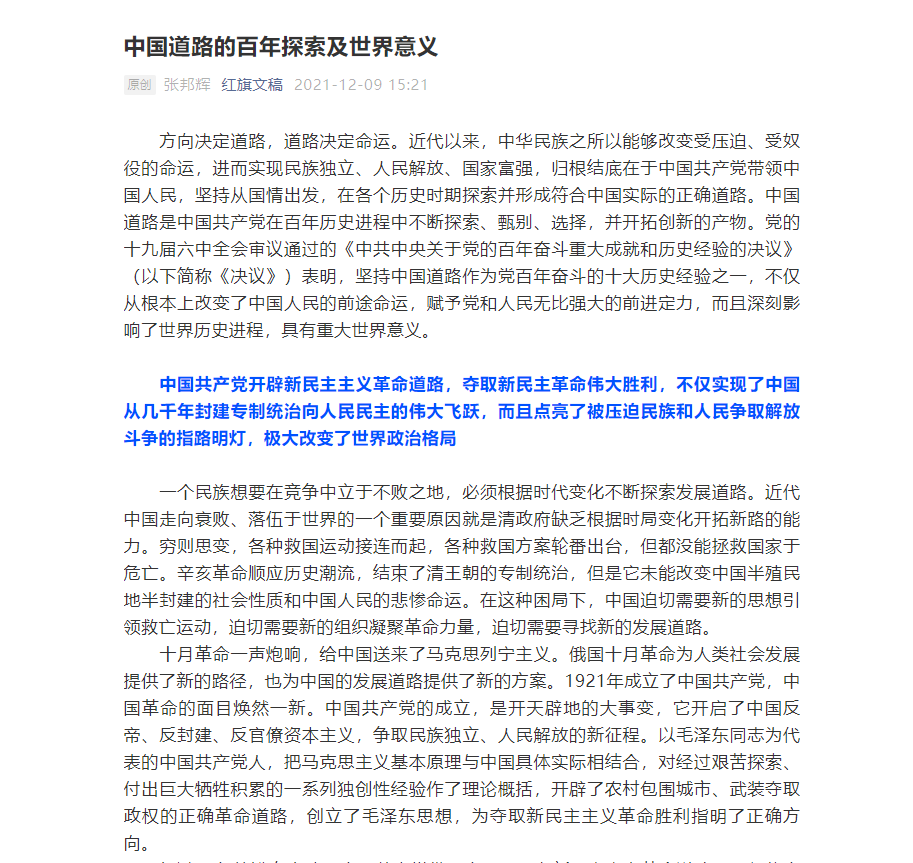 在2021年12月10日出版的《红旗文稿》中,刊发高辣文