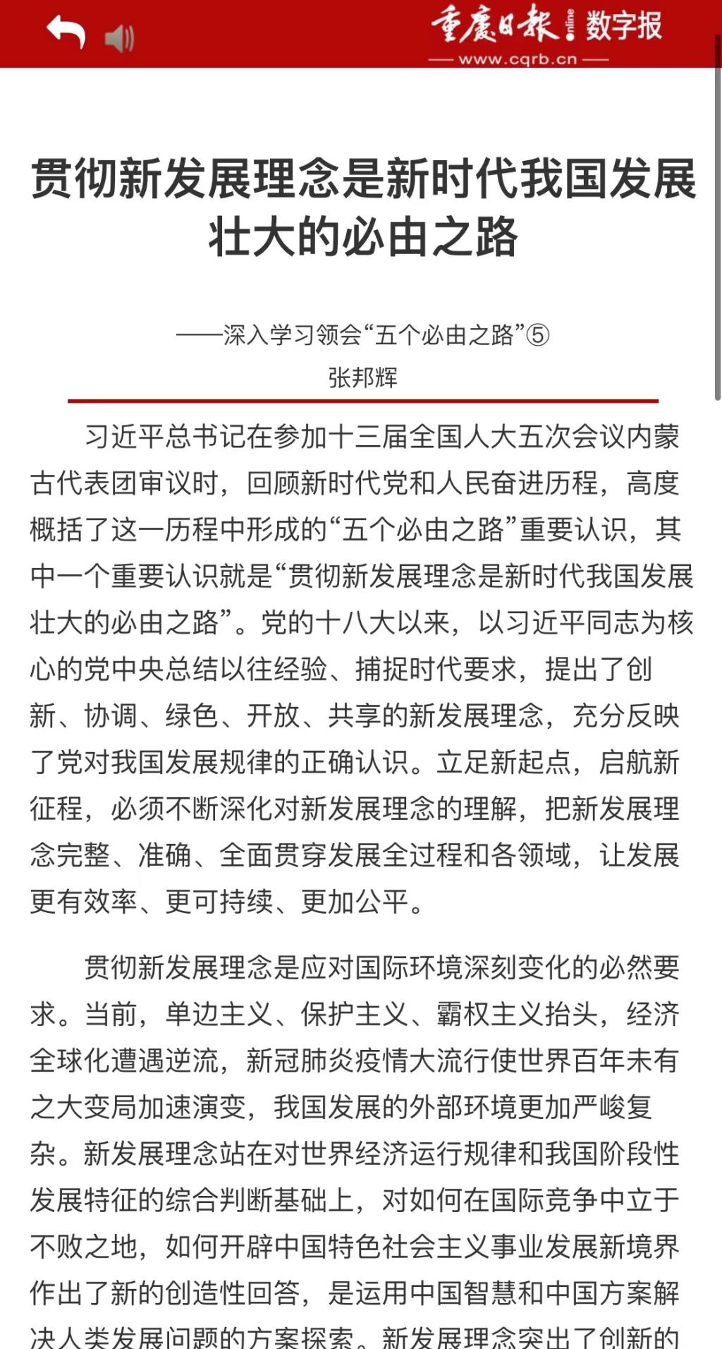 2022年5月5日出版的《重庆日报》刊发张邦辉院长《贯彻新发展理念是新时代我国发展壮大的必由之路》一文,文章深入阐述习近平总书记在参加十三届全国人大五次会议内蒙古代表团审议时,回顾新时代党和人民奋进历程,高度概括了这一历程中形成的“五个必由之路”中的“贯彻新发展理念是新时代我国发展壮大的必由之路”。
