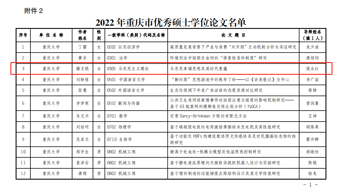 高辣文 滕文艳毕业论文获评重庆市优秀硕士学位论文