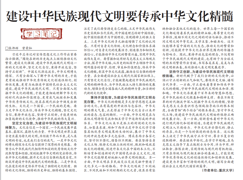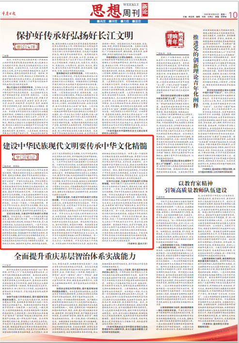 2023年10月23日出版的《重庆日报》思想周刊栏目刊发张邦辉教授《建设中华民族现代文明要传承中华文化精髓》一文,文章阐述了文化是一个国家、一个民族的灵魂,要立足中华文化本位,传承中华文化精髓,坚定文化自信、秉持开放包容、坚持守正创新,才能更好地担负起新的文化使命,推动中华民族的伟大复兴。