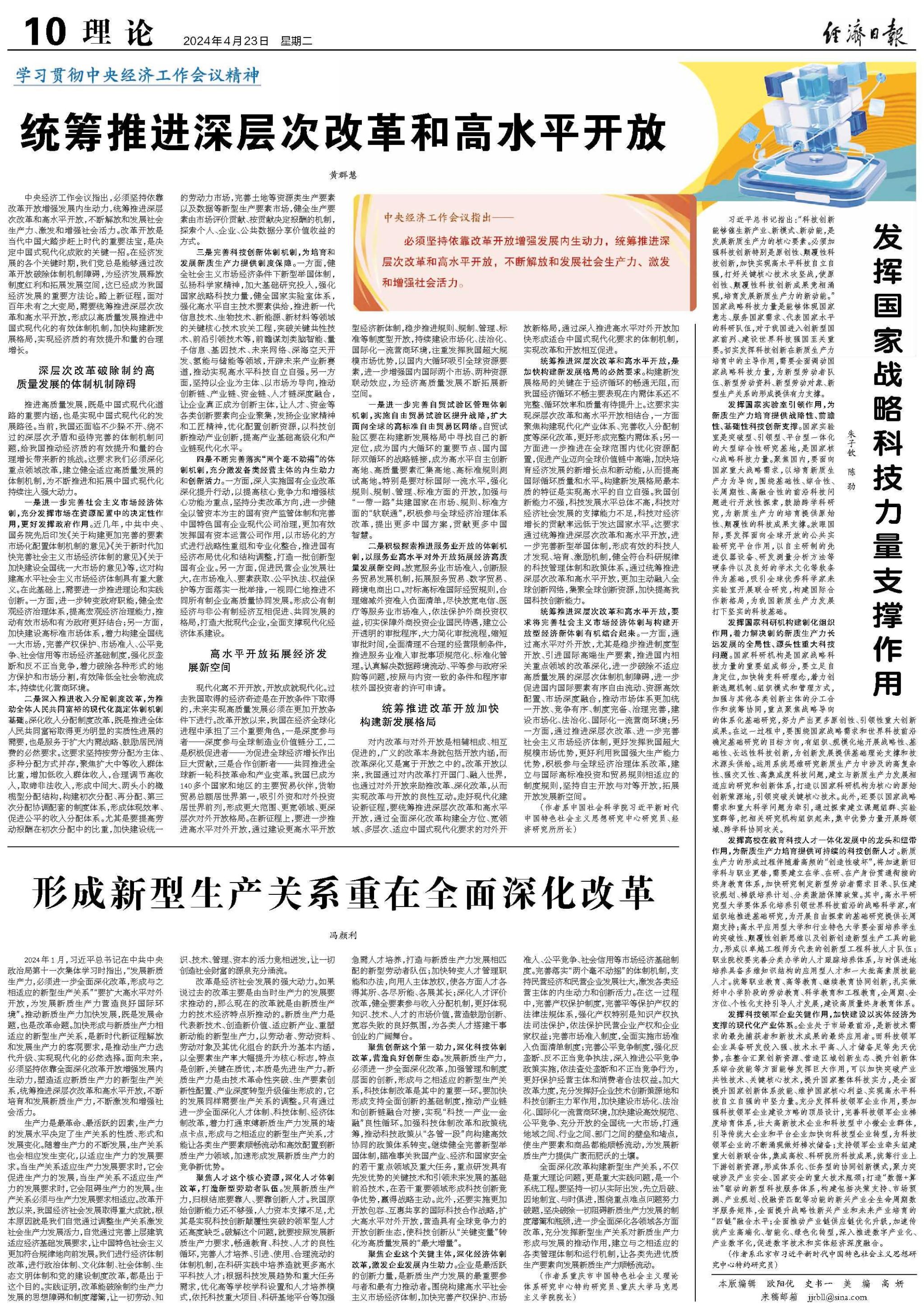 2024年1月,习近平总书记在中共中央政治局第十一次集体学习时指出,“发展新质生产力,必须进一步全面深化改革,形成与之相适应的新型生产关系”“要扩大高水平对外开放,为发展新质生产力营造良好国际环境”。推动新质生产力加快发展,既是发展命题,也是改革命题。加快形成与新质生产力相适应的新型生产关系,是新时代新征程解放和发展生产力的客观要求,是推动生产力迭代升级、实现现代化的必然选择。面向未来,必须坚持依靠全面深化改革开放增强发展内生动力,塑造适应新质生产力的新型生产关系,统筹推进深层次改革和高水平开放,不断培育和发展新质生产力,不断激发和增强社会活力。
